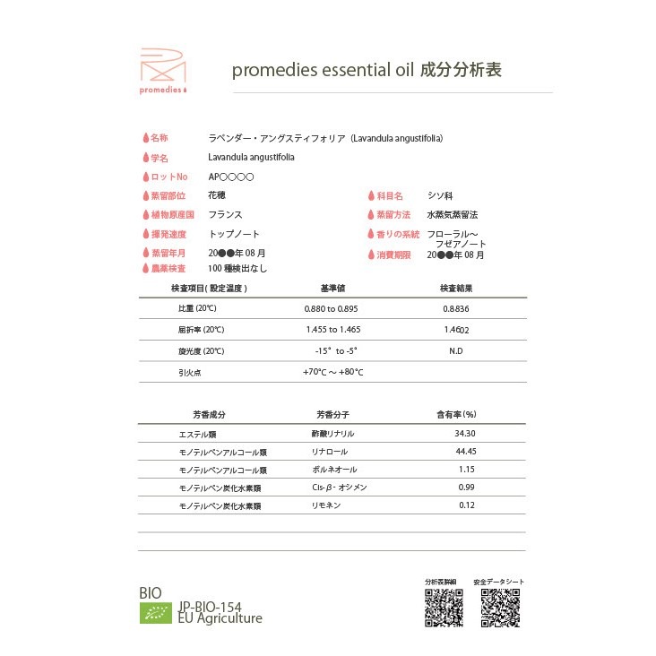 分析表の下部にあるQRコードから、より多くの芳香成分の含有量が記載された情報を読み取る事ができ、安全データシートも公開しています。